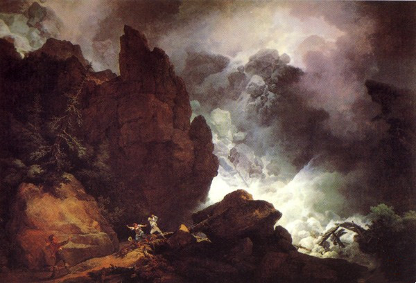 34、阿尔卑斯山的雪崩 1803年 菲利普·卢泰尔堡 英国 109.9cm×160cm 布 油彩 伦敦 泰特美术馆藏 这是一幅以严谨的手法描绘阿尔卑斯山雪崩景象的风景画。画家十分注意造型与色彩的关系,近景的暖色与中、远景的冷灰形成对比,产生了纵深的空间感,块状的山岩造型及不同斜线的构图,造成了雪崩的动感与恐怖气氛。画家以写实的手法,再现了雪崩的奇异与壮观景象,形象地表现了山崩地裂、气势逼人的自然威力