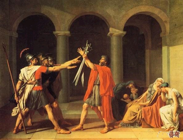 35、荷拉斯兄弟之誓 1784年 雅克-路易·达维德 法国 330cm×425cm 布 油彩 巴黎 卢浮宫藏 荷拉斯,是古罗马时代的一个家族。古罗马共和制时期,罗马人与比邻的伊特鲁里亚的古利茨亚人发生了战争,但双方的人民却有着通婚关系。在这场战争中,荷拉斯兄弟被选出来与敌人进行格斗,达维德表现的正是个人感情服从国家利益的场面--老荷拉斯将武器分发给三兄弟,三兄弟伸出右手向宝剑宣誓……。画家运用了多侧面揭示主题的手法,使悲壮的戏剧性场面,具有无比的丰富性。男人的刚毅、悲壮与女人的哭泣形成对比,深化了题旨的思想性