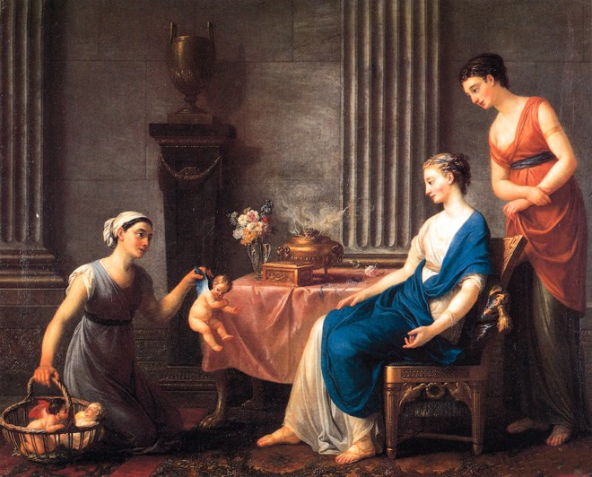 36、贩卖孩子的商人 1763年 约瑟夫-玛丽·维安 法国 96cm×121cm 布 油彩 枫丹白露皇家博物馆藏 这是一幅人神合一题材的绘画,有着典型的新古典主义风格。人物造型严谨,肃穆而冷静。女主人被刻划得高贵而矜持,女商人则从提篮里抓出一个带翅膀的小男孩 (无疑这是小天使),构成一个充满戏剧性的场面。如果说画家描绘的是当时社会现实的话,那么,那个正在被贩卖的长着翅膀的孩子,无疑又给作品增添了扑朔迷离的色彩。