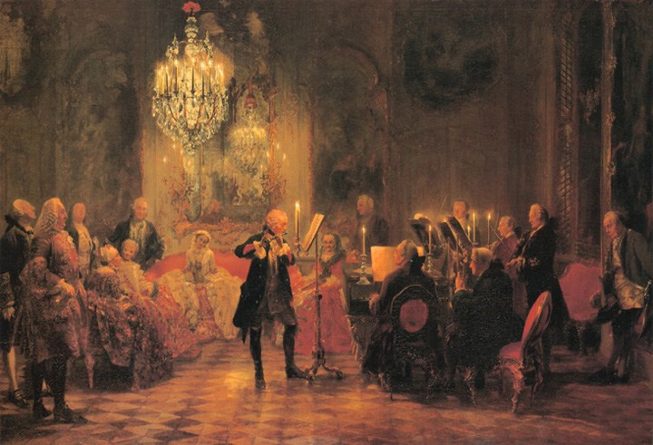 38、笛子演奏会 1852年 阿道夫·门采尔 德国 142cm×205cm 布 油彩 柏林国家美术馆藏 门采尔是德国著名的现实主义画家,《笛子演奏会》显示了他卓越的绘画技巧。整幅作品色彩辉煌华丽,冷暖、明暗的转换与过渡,与画面情绪相融,恰到好处。在总体背景下,人物刻划主次、身份、等级分明。处在灯光照耀下的贵族们,服饰华丽,却被画家以灰调子淡化;处于暗部的乐手们,在烛光下显出全神贯注的神情。真正处于焦点而又被人关注的,是那位笛子演奏家,他姿态潇洒、神情专注,陶醉于曲调之中。灯光给他以暖调,黑衣使他庄重,优美的乐曲,似乎正从演奏家的指尖溢出,并充满了豪华富丽的空间。