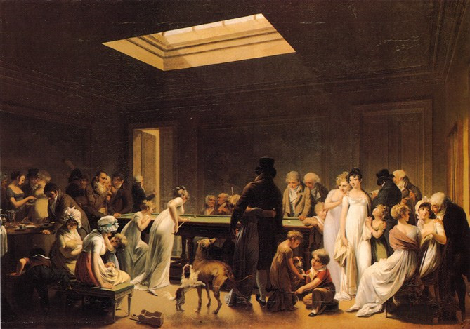 39、桌 球 1807年 路易斯-利奥波德·布瓦伊 法国 56cm×81cm 布 油彩 圣彼得堡艾尔米塔什博物馆藏 在这幅画中,布瓦伊以极熟练的笔法与色彩,描绘了市民阶层的生活与风貌。在一个桌球俱乐部里,数十人集中在一起,打球,聊天,玩耍。其场景被画家处理得井井有条,人物刻画体现出新古典主义画风的完整细致。色彩严谨,素描一丝不苟,成为一幅古典风味极浓的风俗画。