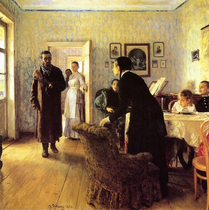 40、意外归来 约1882 伊里亚·叶菲莫维奇·列宾 俄国 油画 160.5×167.5厘米 苏联特列恰柯夫美术馆 这是俄国写实主义大师列宾在19世纪后期创作的《意外归来》。画家塑造了一个在沙皇专制统治下遭受迫害的革命知识分子的形象。经过长期流放和苦役,革命者突然归来。一个面容瘦削、满脸胡须的中年男子走进房里,身上还穿着囚衣。门口的女佣把他看成“陌生人”,妻子吃惊地从请大家认真回复楼主的贴上站起来。画面上还有年迈的母亲和两个幼稚的儿女。这幅画几经周折才得以展出。