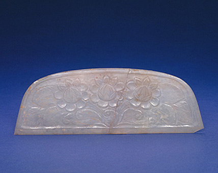 玉花卉纹梳背 玉花卉纹梳背,唐,长13.8cm,宽4.8cm,厚0.2cm。 梳背白玉制,片状,两面饰纹相同。每面边框内凸起浅浮雕图案,中部为3朵花,花朵旁衬托多层叶片,叶宽厚,边沿饰细阴线。 此种梳背是嵌于梳上的装饰。唐代妇女所用梳具十分精致,质地多样,或银,或木,梳上往往嵌有饰件。目前发现的玉梳背多为唐代作品。此件梳背上所饰花叶造型奇异,花心大如苞蕾,花朵下的侧形叶端部回卷,是受中亚造型艺术影响的表现。