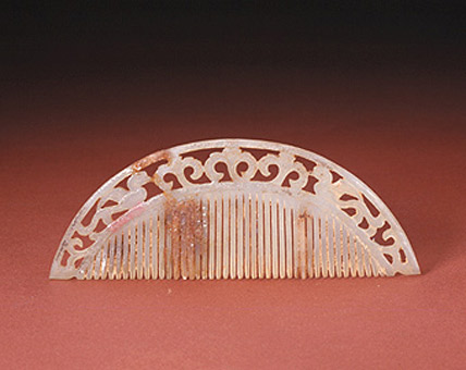 玉花鸟纹梳 玉花鸟纹梳,唐,长10.5cm,宽3.5cm,厚0.4cm。 梳玉色白中略青,半圆形,薄片状。外弧饰镂空花鸟纹,中部为3朵花,两侧各有一鸟。梳齿集于下弦,齿密而间距细小,底端平齐。 唐代妇女往往在头部插梳以为装饰,此件玉梳器薄、齿短,恐非用以梳理头发,而应是置于头部的饰物。唐至五代,用于头部的玉饰品一般都较薄,且玉质精良,表面少起伏变化,刻画图案多用阴线,线条直而密,这些特点在此玉梳上有明显的体现。