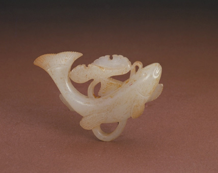 玉鱼莲坠 玉鱼莲坠,宋,长6.2cm,宽4cm,厚0.6cm。清宫旧藏。 玉色白,表面有赭黄色斑。鱼小头,长身,无鳞,鱼身弯成弧状,昂首,尾上翘,鳍短而厚,共6片,其上有细阴线。鱼身旁伴一荷叶,长梗弯曲,盘而成环,可供穿系绳。 西周以后鱼类玉器数量锐减,唐代又有回复,宋代佩鱼之风又盛,出现了较多的玉鱼,样式、种类不一,或与荷莲、茨菇相伴,或仅单条鱼,或无鳞,或饰横向水线,或饰网格纹。此风一直延续到元、明、清时期。荷花与鱼相并含有连年有余之意,是吉祥图案的一种。