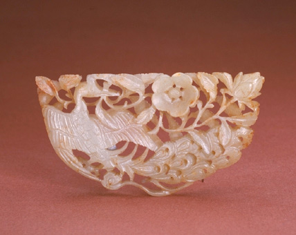 玉孔雀衔花饰 玉孔雀衔花饰,宋,长7.6cm,宽3.8cm。清宫旧藏。 花饰玉色青白,有赭色斑,为半圆形玉片,其上透雕孔雀衔花图案。图案主体为孔雀,孔雀回首,拖尾,展翅,口衔花枝,枝上有花两朵,品种不同。 花鸟类玉器在宋、辽、金的考古发掘中多有出土,其中不乏鸟翅一只伸开、另一只下折的造型,这种鸟衔花玉饰是宋代较流行的样式。北京房山石棺墓出土有孔雀形玉发饰,孔雀之尾端带有半月状透空孔洞,同此件作品孔雀尾部的表现相同。此件作品较一般宋代花鸟玉佩更为精致,据其形状,可能是一种嵌饰。