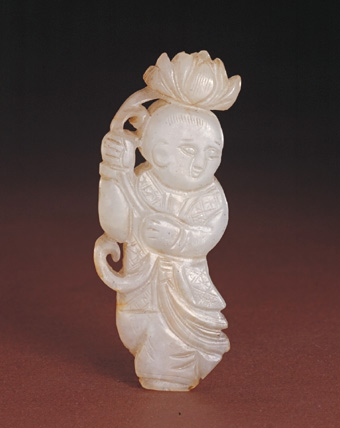玉举莲花童子 玉举莲花童子,宋,高7.2cm,宽2.8cm,厚1.1cm。清宫旧藏。 玉呈暗白色,雕一童子,著细袖衫、肥裤,外罩一长马甲,马甲上刻方格“米”字纹。童子头向左侧,露右耳,双手举莲花一枝,花朵置于头顶。 作品为宋代玉童子的典型形象,五官表现简单,以少量的短弧线表示衣纹。衣、裤、马甲等装束在同类作品中多有出现。唐代时,器物中已有荷莲童子图案,宋以后,这类玉雕童子日多,作品有“连生贵子”的含义,寓意吉祥。