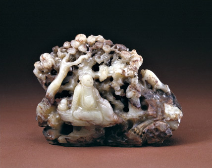 玉松阴听泉图山子 玉松阴听泉图山子,宋,长10.5cm,高9cm,厚4.5cm。清宫旧藏。 玉质青白色,含有较重的赭、褐色斑。随玉料外形雕山林景色,正面山林中,松树下,一老人坐于石上,衣带似解,左手扶膝,右侧置一葫芦,一侍童立于身旁,双手捧杯。一小溪顺势而下,上游一鹿俯首而立。山子背面雕大叶柞树。作品中山石用孔洞透空之法雕出,小溪则以集束折线表示,人物衣纹简单,为宋、元时期玉器风格。观松下之人,非农非儒,闲散洒脱,作品表现的是一种富裕的山林生活。