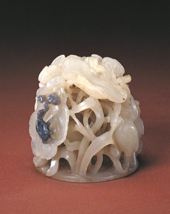 玉荷鹭纹炉顶 玉荷鹭纹炉顶,宋或金,高5cm,底径4.3-4.7cm。清宫旧藏。 炉顶玉质白色而局部为黑色,整体近似圆柱形,顶部略细,镂雕荷叶、芦草缠绕状,荷叶巨大而张开。一张荷叶上有黑色乌龟爬行,口吐烟云,其旁有荷花,荷、芦中可见5只鹭鸶隐现其间。器底部有一平板以示水面,其上有孔,可穿绳结系。 荷叶、水草、水鸟、龟等图案在宋、金玉器中非常流行。四川广汉南宋窖藏出土有龟巢荷叶带饰,北京丰台金代涡古沦墓出土有龟巢荷叶玉饰,与此作品应属同类题材。此外,上海地区的元代墓葬中也曾出土类似的饰荷叶、鹭鸶图案的炉顶。这表明此类作品的使用地域广泛,流行时间长,对后世玉器有很大影响。