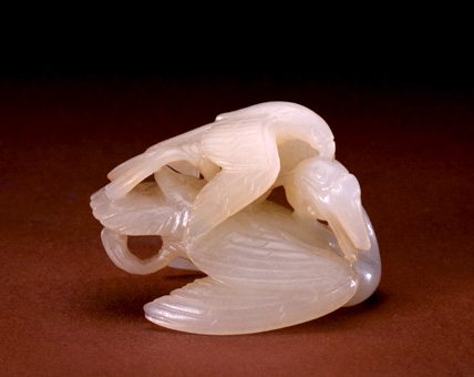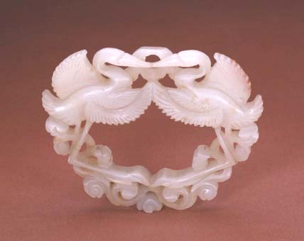 青玉双鹤佩 青玉双鹤佩,宋,长6.8cm,宽4.3cm。清宫旧藏。 质似白玉,微带青色,鹤头相对,双鹤翅爪相接,作展翅欲飞状。上部有孔备穿系,知是佩饰。 这件寓意祥瑞的双鹤佩的制作,受道教影响,并反映出宋代道教的发展。宋代道教影响的扩大同某些帝王崇尚道教有关。史书记载宋徽宗好道教,并把鹤作为祥瑞之物。玉雕中对称动物布局渊自唐代,但这种双鹤题材却是自宋代逐渐增多的。