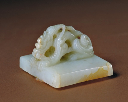 元白玉龙钮押 白玉龙钮押,元,长5.8cm,宽5cm,高4cm。 玉押方形,略厚,底面有凸起的阳文图记,上部为龙形纽,龙身短而似兽身,头上有角,披发,四肢粗壮,肘部饰上扬的火焰纹,三岐尾,中一岐长,上冲与头顶发相接。 押是一种符号,签画于文书,表示个人的许诺,后为使用简便而刻之。元代陶宗仪《缀耕录》记:“今蒙古色目人之为官者,多不能执笔画押,例以象牙或木刻而印之,宰辅及近侍官至一品者,得旨则用玉图书押字,非特赐不敢用。”据此可知元代用玉押者较用象牙、木刻类押者身份等级要高。