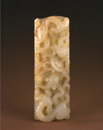 玉双螭纹臂搁 玉双螭纹臂搁,元,长10cm,宽3.4cm,厚1cm。 臂搁玉色青白,有赭色斑,片状,长方形,两端呈“S”状,两侧下卷,正面凸雕双螭衔灵芝图案,背面饰云纹。 此件作品为已知的早期玉臂搁。宋以后,玉器中大量使用螭纹装饰,但螭的形象已无汉代螭纹的特点,更似爬虫。双螭灵芝图案在元代玉器上较为多见,据此作品的样式、螭纹及灵芝的特点可确定为元代所制造。