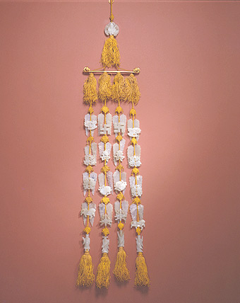玉组佩 玉组佩,明晚期,通长53.6cm。清宫旧藏。 组佩由53件玉饰串成。上部以一件寿星骑鹤式玉纽总揽组佩,其下有金质横梁,横梁两端为龙头。横梁下悬有4串玉片,每串由上下5组构成,横向相对。上4组玉饰每串各为3件,其中2件为玉叶,1件为玉镂件,玉镂件分别为“卍”字、“寿”字、凤、双鱼、双桃、华盖、麒麟等,第5组均为单个玉文臣。这类成组玉饰产生的年代很早,与《诗经》中所言“杂佩”类似,按不同的部位,玉件被称为“珩”、“琚”、“瑀”、“冲牙”,佩戴于人身,行走时玉件相触而有声。明代墓葬中出土有成组玉佩多套,如定陵中即有与此件类似的组佩。这组玉佩所用白玉质地优良,加工精致,是宫廷玉器中的精品。