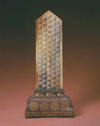 玉谷纹圭 玉谷纹圭,明,高21.3cm,宽6.3cm,厚0.9cm。清宫旧藏。 玉圭表面有旧色,厚片状,顶部有凸起的圭角。两面饰纹相同,为5列凸起的谷纹。圭下部呈方形,插入饰填金纹饰的紫檀木座中。木座顶部雕海水江崖,其下刻阴线夔龙纹,座四面共饰12组图案,为古代的“十二章”。插圭处的凹槽内刻有“大清乾隆年制”六字款。 此种谷圭在明代墓葬中发现多件,为贵族妇女身上的装饰。玉圭的木座为清代宫廷所制。