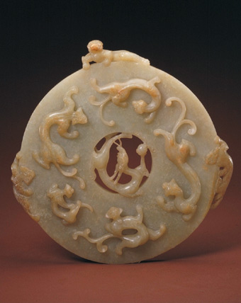 玉九螭璧 玉九螭璧,明,直径20.4cm,孔径5.8cm,厚2cm。清宫旧藏。 玉璧为暗青色,有黄斑,圆形,一面饰谷纹,一面浮雕9条螭纹。璧中央孔中1条螭纹为龙首、兽身,一前爪握火珠。璧正面凸雕5条螭纹,皆小头独角,团团围住中孔之螭。璧边缘处有3条螭,后肢与尾在璧的背面。 古人认为螭是龙的一种。宋、元以后,多以螭龙纹装饰玉璧。此作品以玉璧表示天际的广阔,以九螭表示皇族的兴旺,应是明代宫廷用品。