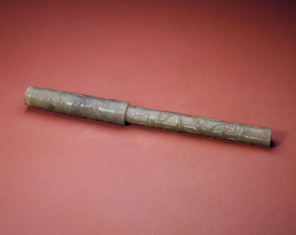 玉螭纹笔 玉螭纹笔,明,通长23.7cm,管径1.6cm,帽径2cm。清宫旧藏。 笔管青玉制,直管,无斗,顶部封堵玉片。笔管端部饰阴线回纹,中部饰凸雕的蟠螭。笔帽亦为青玉制,直管式,较笔管略粗,可套接于笔管上,笔帽两端饰阴线回纹,中部亦雕一螭。 一般毛笔应由笔管、笔毫、笔帽三部分组成。一些笔因毫较多,需另配笔斗以固定笔毫,谓之斗笔。此笔因年代久远,笔毫已失。