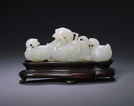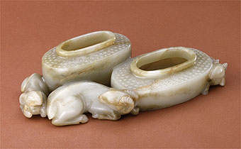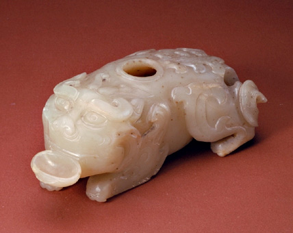 玉卧兽形砚滴 玉卧兽形砚滴,明,长12.7cm,宽6.5cm,高5.1cm。清宫旧藏。 砚滴玉色青白,卧兽形,略仿汉代辟邪样式,但有较大变化,兽头有双角,粗眉,大眼,口衔小羽觞,四肢伏于地,肢上有火焰纹装饰,背后部有骨椎状装饰,卷尾。腹部有“乾隆年制”四字款,为后刻。背部有孔可通腹部,腹内空可蓄水。 砚滴为文房用品,一般配有滴注,可用滴注将所蓄之水吸出,滴于砚。汉代已有飞熊、卧羊、辟邪、鸠凤等多种样式的玉质砚滴,常为后代所模仿。这种砚滴在明代又被称为“水中丞”,除用于蓄水外还是文房内的陈设品。