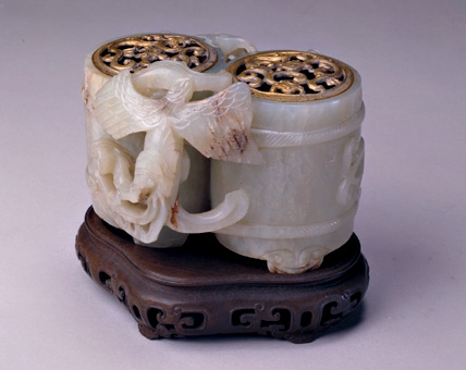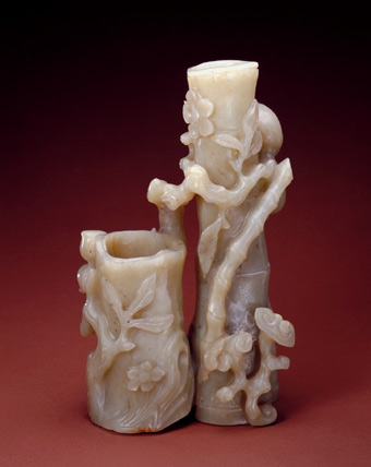 玉双管式笔插 玉双管式笔插,明,高21.9cm,大口径5.5-6cm,小口径4.5-4.7cm。清宫旧藏。 笔插青玉制,色略暗。形制为竹节及桃桩相连式,竹节略高,内空,其外有小竹枝、灵芝相附。桃桩与竹节相并,内空,其外有桃枝、桃叶及果实,一桃枝伸展,连于竹节之上,桃桩下部饰兰花之花叶。 笔插是文房用品,管内可插笔或其它物品。明代,室内陈设及文房用品中多有此类作品。笔插取竹、桃、兰、芝之形,以象征君子之德。此作品造型高低错落,生动逼真,是明代玉器中的精品。
