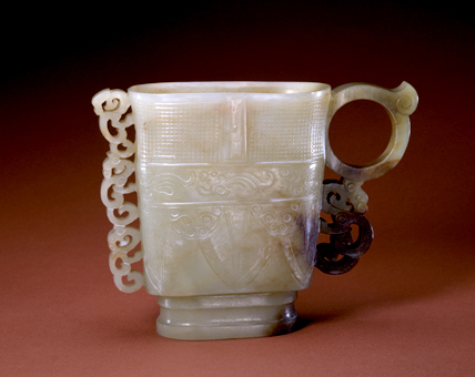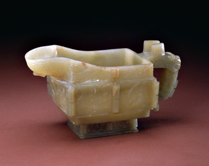 玉兽面纹匜杯 玉兽面纹匜杯,明,高9.2cm,口长13.2cm,口宽7.5cm。 此匜杯由整块玉料琢成,器分上、中、下三部分。上部为口,前凸而后方,凸出部分为流,口沿外侧饰夔纹、凤纹。中部为腹,上饰浅浮雕兽面纹。下部为长方形器足,足下有沿,足外饰夔纹。匜的四角及中部出戟。匜柄为兽吞式,柄上部为兽首,仿古样式,巨耳,粗眉,张口,口吞夔式柱,其外饰勾云纹。 匜为古代盛水之器,此杯样式仿古匜而有所变化,装饰图案也与古器不同,凤纹的使用更具时代特色。此匜杯杯体方正,图案古朴,为明代仿古器的代表作之一。