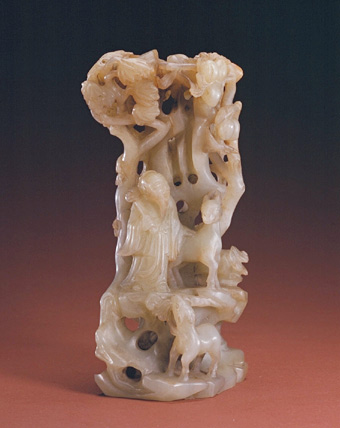 玉寿鹿山子 玉寿鹿山子,明,高14.8cm,宽9cm。清宫旧藏。 山子玉料青绿色,雕立体山林景致。作品下部为山石,其上高树成荫,并结有桃实,树下一老人当风而立,著长袍短褂,左手轻抚身旁小鹿,右手持如意,崖下又有一小鹿,口衔灵芝,仰首面向石上的老人。 玉山布局有致,以桃、鹿、如意、老人之造型表现吉祥长寿的主题。加工时采用了镂雕技法,作品中保留着较多的镂雕孔洞以表现山石的风化与穿孔,树木枝叶处精雕细琢,因势就形,边角处打磨圆润,具有典型的明代玉雕艺术的造型风格。这类玉雕作品主要用于室内陈设,今人称为“摆件”。