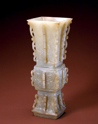 玉八出戟方觚 玉八出戟方觚,明,高22.7cm,口径8.1-8.5cm,足径4.9-6cm。清宫旧藏。 作品为方柱形,分为上、中、下三部分。上部为撇口,粗颈,其外饰阴线琢出的变形蝉纹及双夔纹,四面花纹相同。中部为觚腹,四面微外凸,饰变形蝉纹,花纹与觚颈纹饰相呼应。下部与上部对称但稍短,上饰变形蝉纹。足下有一周方形榫式座。觚四面的中部各有一道凸起的戟线,戟线分成多节,每一节上有阴线图案。觚的四角饰有镂雕的卷草形装饰,这类装饰称为“出戟”,四面及四角出戟者称为“八出戟”。明朝时多用觚作为室内陈设,觚内或插如意,或插博古挂件。