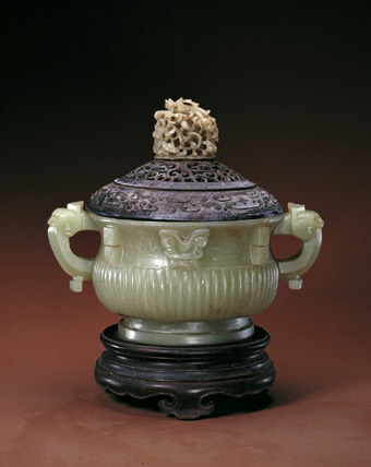 玉条纹兽耳簋 玉条纹兽耳簋,明,高8.8cm,口径13.2cm,足径9.4cm。清宫旧藏。 簋玉色暗青,圆形,敞口,颈部微内收。簋两侧各有一个兽吞式耳,形为兽头口吞夔形柱。器身两面图案相同,每面各有两个用以装饰的凸戟,中部为凸雕片状兽首,兽首两侧各有一阴线夔纹。簋的腹部排列纵向条纹,其下有圆形圈足。 簋为商、周时流行的食器,这件作品为仿古器,造型较商、周古器有所变化。明代,这类仿古簋可用于室内陈设,也可用于燃香。此簋的木盖为清宫所配,紫檀木质,上雕仿古云纹及镂空卷草纹,盖钮为元代玉件。从木盖的形式上看,此物在清代宫廷中曾作为贮放香料的香薰。