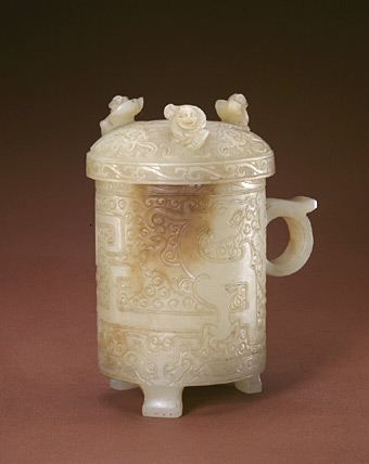 玉兽钮夔龙纹樽 玉兽钮夔龙纹樽,明,通高11.2cm,口径6.2cm。清宫旧藏。 樽玉料青白,略显黄色。圆柱状,一侧为环形杯柄,柄上部有扳。樽深腹,平底,其下3足。樽身外壁饰夔龙纹及谷纹,下部近3足处分别饰兽面纹。盖隆顶,盖面上等距立雕3个兽形钮,似羊,盖面中部饰涡纹。 樽为古代酒器,在汉代较流行,常见有铜、漆、玉质作品。此件作品与汉代玉樽相似,花纹略有变化,工艺不如汉代作品精致。清宫旧藏中存有明代仿古玉樽多件,北京地区考古发掘中也发现有陆子冈款的代表作品。陆子冈是明代治玉大家,可见此类作品在明代玉器中的地位。