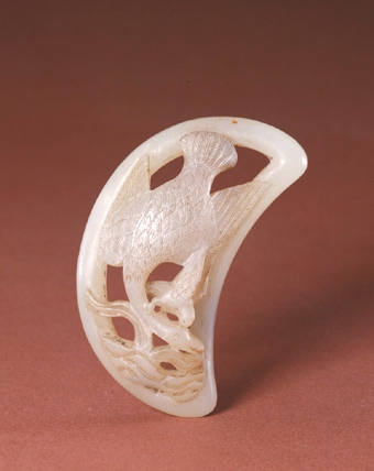 “御用监造”玉海东青啄雁饰 “御用监造”玉海东青啄雁饰,明,长5.5cm,宽3.5cm,厚1.4cm。 玉饰暗白色,月牙形,中间透雕一海东青啄大雁头,迫其降落于水,下部有水波与苇叶纹。作品背面边柱上有阴线“大明宣德年制”、“御用监造”款识。 “御用监”是明代宫廷内专司造办用品的机构,由此而知此物为明代宫廷督造的用品。传世的明代玉器中带有制造年款的非常少,而带有“御用监”款的作品仅此一件,因而非常珍贵。“海东青啄雁”的图案反映了我国北方地区养鹘捕雁的习俗,同类题材在辽、金玉器中大量出现。从造型判断此饰物应为妇女的头饰。