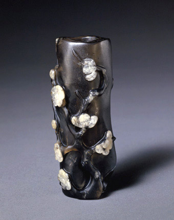 “子冈”款茶晶梅花花插 “子冈”款茶晶梅花花插,明,高11.4,口径4.2cm,底径3.8cm。清宫旧藏。 花插筒状,茶色,梅树干形。器身有白斑,巧做俯仰白梅二枝,花蕾并茂。一面琢隐起两行行书“疎影横斜,暗香浮动”八字。末署圆形“子”、方形“冈”阴文二印。充满了文人画韵味,格调高雅,技艺不凡。原藏清宫南库。 水晶依质色不同称紫晶、绿晶、茶晶、墨晶、蓝晶、发晶、鬃晶、黄晶等。出于矽卡岩、伟晶及热液脉状矿床中(砂矿)。茶晶产于我国内蒙、甘肃等地。此茶晶有白斑,玉工因材施琢白梅,是冰晶器中难得的俏色之作。