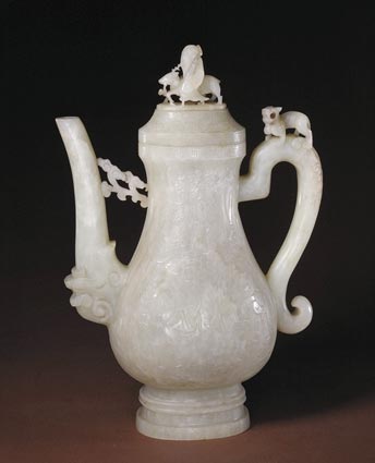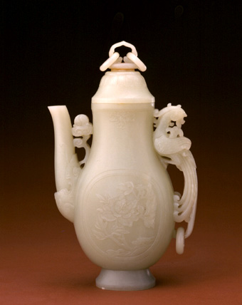 青玉凤柄执壶 青玉凤柄执壶,清,通高22cm,口径4.9-5.7cm。 此执壶玉质纯正,表面光亮。壶体扁而高,椭圆形口,盖与壶口呈插接式,咬合紧密,盖钮为镂空如意形,套二活环,钮之下饰一周莲瓣。壶颈部饰变形莲花纹,腹部有椭圆形开光,开光内凸雕牡丹等图案。壶流为兽吞式,流柱自兽口中接出。壶柄为一全身栖凤,凤尾下部套一活环。 此作品的设计水平较高,将传统的如意、莲花、莲瓣、牡丹等图案运用于壶体,表现形式不落俗套,且加工精致,造型准确。执壶之柄造型复杂,不易掌握。壶盖高大而易脱落,因而不宜实用,是一件按照实用器设计的陈设品。
