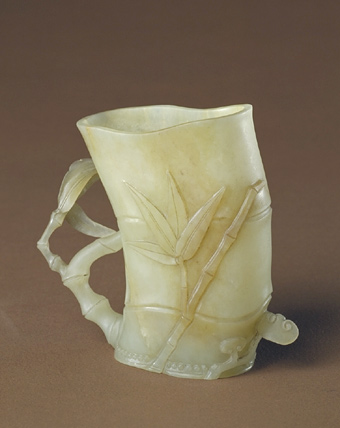 青玉竹节杯 青玉竹节杯,明,高10.5cm,口径7.5-3.9cm。清宫旧藏。 此杯用料为新疆和阗产的青白玉,局部有浅黄色斑沁。杯作扁圆的三节竹筒状,杯身两节中空,以一竹节为杯底,杯体微微弯向一侧,杯柄雕成卷曲的竹节形。杯身两面各浮雕竹叶纹。节上琢有谷纹。 明代中晚期,茶酒之饮器制作讲究,玉酒具的制作也得以发展,器形和纹饰都颇丰富,既有仿古型,也有创新型。此杯造型独特,选材精细,是明代玉器中具代表性的作品。