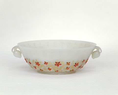 清 和阗白玉错金嵌宝石碗 和阗白玉错金嵌宝石碗,清乾隆,高4.8cm,口径14.1cm,足径7cm。清宫旧藏。 碗玉质莹白。器壁薄,横截面为圆形,由口及腹斜收,桃形双耳,花瓣式圈足。腹外壁饰花叶纹,独具特色的是枝叶由金片嵌饰而成,花朵则以108颗精琢的红宝石组成。腹内壁有阴文楷书乾隆帝御制诗一首,全文为: 酪浆煮牛乳,玉碗拟羊脂。 御殿威仪赞,赐茶恩惠施。 子雍曾有誉,鸿渐未容知。 论彼虽清矣,方斯不中之。 巨材实艰致,良匠命精追。 读史浮大白,戒甘我弗为。并有“乾隆丙午新正月”、“御题”款识及“比德”印。碗内底正中有隶书“乾隆御用”四字。 艺术作品的风格与制作者的审美取向相关,在白如凝脂的玉上错以黄金,镶嵌红色宝石,显得格外豪华富丽。本器具有典型的痕都斯坦风格,通过器物外在的华美体现出西部民族特有的热情奔放的性格特色。正因此碗具有独特的艺术神韵且仿制功力精湛,所以自乾隆五十一年(1786年)制成后始终为乾隆皇帝所珍爱,甚至在庆典活动时还被当作御殿赐茶的用具。