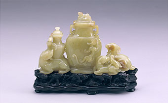 黄玉三阳开泰双连盖瓶 黄玉三阳开泰双连盖瓶,清乾隆,通高10.8cm,宽17.5cm。清宫旧藏。 瓶黄玉质,大瓶居中,扁圆形,椭圆形口、足,口上有盖,盖面凸雕一兽纽。瓶身光素,凸雕蟠螭纹。瓶底阴刻篆书“乾隆年制”四字款。大瓶一侧凸雕3只羊,两大一小,小羊立于一大羊的背上。大瓶另一侧由一玉兽承托小瓶,小瓶圆形口、足,瓶外凸雕螭凤纹。 作为与中华先民生产、生活息息相关的家畜,羊自古便被赋予了某种神秘的色彩。人们时常将羊之名附会人事祸福,如“羊祸”、“悬羊头门上,除盗贼”,又以“羊”与“祥”相通,将“吉祥”写作“吉羊”,汉瓦当中亦有“大吉羊”之字样。加之古人认为“美”与“善”皆与羊相关,因此,以羊作装饰多为寄托吉祥美好的愿望。 此器选用上好名贵的黄玉精雕细琢,并有“乾隆年制”的款识,不失为清中期具有代表性的玉器珍品。