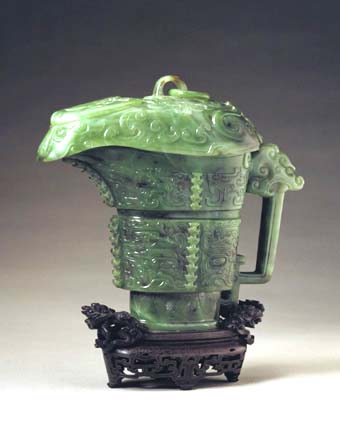 碧玉仿古觥 碧玉仿古觥,清乾隆,高18.7cm,口宽7.4cm。 此件碧玉觥是仿古铜器的饕餮纹觥,玉质的墨绿色很自然的呈现着青铜銹斑的色泽,是造办处的精品。 清代养心殿造办处“玉作”制造的范围,以玉为主,同时包括一切需要砣工制造的物料,如玛瑙、碧玺、翡翠等。当时的许多城市也有玉匠,如苏州、扬州和回部地区均是高手集中地。乾隆时期扬州市场上曾出现大量玲珑剔透的玉器。当时的监政和织造把这种玉器作贡品,遭到乾隆皇帝的申斥。乾隆五十九年(1794年)八月十四日,曾有一道谕旨给扬州监政和苏州织造,大意是说此后务须严行禁止不准再镂雕这类玉器。因为凡是容器,镂空之后没什么用处,即使不是容器,通体玲珑则玉质的美完全消失了。 这道谕旨很切中当时玉器制造的时病。这里所介绍的碧玉觥是养心殿造办处造的所谓杜奇归朴的器物,是属于纠正时病的器物。