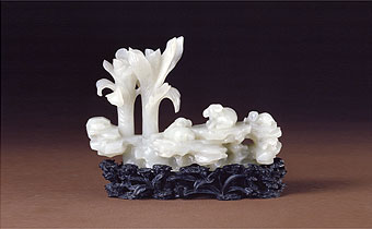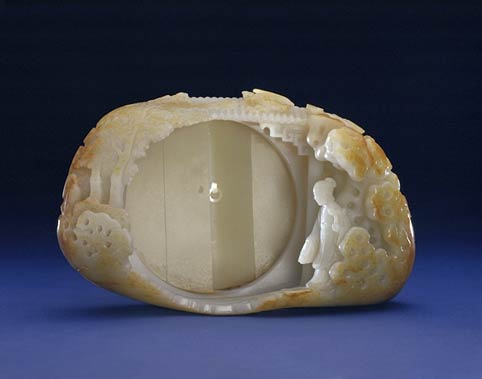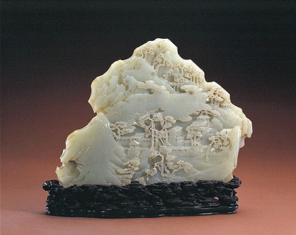 桐荫仕女玉山 桐荫仕女玉山,清乾隆,长25cm,宽10.8cm,高15.5cm。 此玉山白玉质,有黄褐色玉皮。以月亮门为界,把庭院分为前后两部分,洞门半掩,门外右侧站一女子手持灵芝,周围有假山、桐树;门内另一侧亦立一女子,手捧宝瓶,与外面的女子从门缝中对视,周围有芭蕉树、石凳、石桌和山石等。器底阴刻乾隆御制诗、文各一。诗云: 相材取碗料,就质琢图形。剩水残山境,桐簷蕉轴庭。 女郎相顾问,匠氏运心灵。义重无弃物,赢他泣楚廷。末署“乾隆癸巳新秋御题”及“乾”、“隆”印各一。文曰:“和阗贡玉,规其中作碗,吴工就余材琢成是图。既无弃物,且仍完璞玉。御识。”末有“太璞”印。 本器从内容到风格皆仿油画《桐荫仕女图》而作,所用玉料实为雕碗后的弃物,但玉工巧为施艺,庭院幽幽,人物传神,人们似可听到两女子透过门缝的窃窃私语。剩料被加以利用,这种取其自然之形和自然之色传以生动之神的做法,正符合“势者,乘利而为制也”(《文心雕龙·定势》)。此器是清代圆雕玉器的代表作。