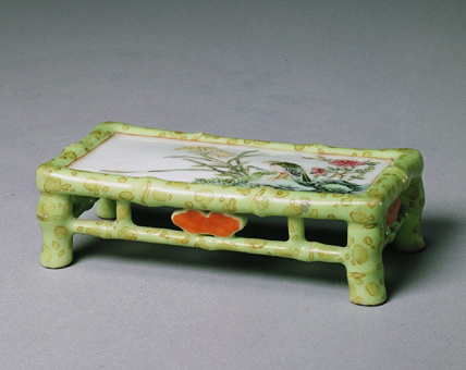 仿斑竹五彩花鸟纹墨床 仿斑竹五彩花鸟纹墨床,清乾隆,高2.5cm,长8.6cm,宽4.3cm。清宫旧藏。 墨床仿竹床形,床边及四足施淡绿釉,上饰褐黄色斑点,颇似斑驳的嫩竹。床面饰白地五彩山石花鸟纹,背面书红彩“九畹山房”四字篆书款。 此器造型秀巧新颖,悦目怡人,釉彩柔嫩淡雅,仿佛通体散发出自然的馨香,是一件雅韵十足的瓷质文房用具。