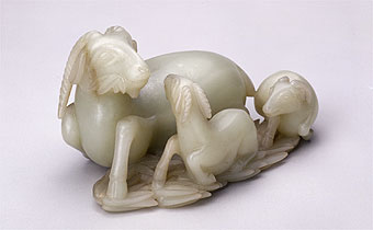 青玉三阳开泰 青玉三阳开泰,清,高9.5cm,长18.2cm,宽10.5cm。 整器圆雕3只羊,青玉质地,玉色青白。羊一大二小,大羊侧卧于地,左前肢支踏于地上,其余三肢曲起收于腹下,抬首转向左侧,口衔竹叶。大羊左侧以竹叶铺地,其上卧伏两只小羊,一小羊居前,侧头转向大羊,右前肢踏地,似欲从大羊口中取食,另一小羊紧伏于大羊身后。三羊皆有角,角上有节。以三羊为饰,寓意“三阳开泰”。