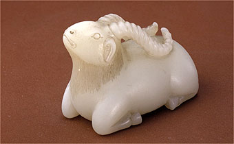 白玉卧羊 白玉卧羊,清,高5.8cm,长10.2cm。 此羊白玉质,玉质上佳,无杂质,莹润如凝脂。羊呈卧形,昂首望天,口紧闭,耳下垂,双角向后弯曲。腮下、耳后及尾部边缘有细刀琢刻的短阴线,以示羊毛。羊身其余部分光素无纹饰。 清代玉羊与前代风格略有区别,着重于动态的表现,且比前代更加写实,造型准确,骨骼、肌肉加以突出的表现。此白玉羊造型简洁明快,刀工精湛,打磨润泽,更因其质地洁白无瑕,使羊之温顺的性情与肥美的体态得以极好的展现。