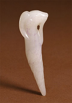 玉羊首觽 玉羊首觽,清,长5.5cm。 觽白玉质地,顶部粗,尾部尖细。顶端饰双角羊首,并透雕阴刻长长的胡须。器身细长似锥,其上琢刻绳纹。此器为清代仿战国玉觽的造型。