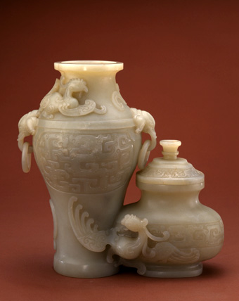 青玉双连尊 青玉双连尊,清,高27.4cm,长26cm,宽13.5cm。 此尊玉色青白,无瑕斑及杂色。高、低二尊,下体相连。高尊圆口无盖,颈部环一凤,展翅似飞翔,腹上部较粗,浅浮雕夔龙纹,两侧各一象首,下套活环。低尊扁而宽,有椭圆形盖,上饰浅浮雕夔凤纹,宽腹,亦饰夔龙纹。两尊相连处亦雕一凤,与另一凤呼应。器底有篆书“大清乾隆年制”款。 此件双连尊是清中期制造的宫廷陈列品,设计巧妙,于仿古中融入新意,加工工艺精致,是乾隆时期宫廷玉器的代表作品。
