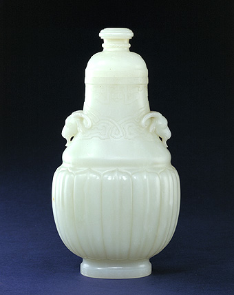 白玉羊首耳瓶 白玉羊首耳瓶,清,高27.5cm,口径5.4×7cm,足径5.5×7.9cm。清宫旧藏。 椭圆形,细颈,宽腹,双耳,椭圆足。盖顶下凸起绳纹一周。颈部浅雕夔带纹,腹琢莲瓣纹,肩两侧凸离羊首耳。玉质莹润。 羊字通“祥”。古代“吉祥”多作“吉羊”。羊字又通“阳”。《史记·孔子世家》:“眼如望羊”。《释名·释姿容》:“望羊:羊,阳也。言阳气在上。举头高,似若望之然也。” 正因为“吉羊”为“吉祥”之意,所以从汉代以来,羊的雕塑品、装饰物都很多。此瓶以羊首饰耳,取吉祥、高望之意。原藏清宫翊坤宫。为乾隆时期的珍品。