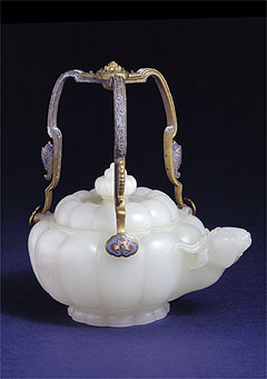 玉羊首提梁壶 玉羊首提梁壶,清嘉庆,通梁高16.8cm,通盖高10.1cm,口径8.9cm,足径6.8cm。 壶白玉质,玉白如脂。壶体为圆形,通体及盖、纽均雕作瓜棱状,腹部一侧凸雕羊首为流,肩部设3个系纽,上接3柄如意形铜胎掐丝珐琅质地的提梁。壶底中部阴刻隶书“嘉庆御用”四字款。 玉壶是清代宫廷重要的生活用品之一,样式极多,除羊首壶外,尚有凤首壶、龙首壶等,还有与玉杯、盘成套者。此壶以瓜棱形作器身,以羊首作流,结合了动物和植物的题材,又将玉器的素净与珐琅的斑斓集于一器,造型新颖别致,从质地到作工均属上乘,为清嘉庆时期不可多得的艺术珍品。
