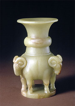 黄玉三羊尊 黄玉三羊尊,清,高14.2cm,口径7.6cm,底径6.8cm。 此器黄玉质,局部有褐色浸痕。圆形口外侈,颈部有环状凸棱,腹部凸雕三羊首,三羊前足形成器足,足下衬一圆托。 三羊组合的艺术造型和纹饰图案在清代非常盛行,除玉器外,陶瓷、绘画中也往往以“三阳开泰”为题作为岁首称颂之辞。但黄玉雕三羊尊这样的器物却非常少见。