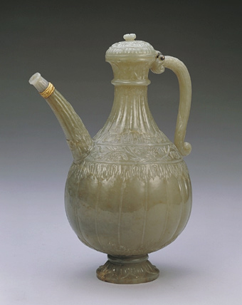 青玉瓜棱执壶 青玉瓜棱执壶,清,高26.7cm,口径5.6cm,足径7cm。 壶青玉质,圆口,圆盖,长颈,高挑流,曲柄,瓜棱形腹,莲座式足。壶肩琢一周缠枝花纹,壶嘴处嵌一金圈装饰。此壶玉质莹润,工艺精细,为痕都斯坦玉器风格。 痕都斯坦玉器出现于汉地,首见于清乾隆时期,受波斯文化和伊斯兰艺术风格的影响,其注重选材用料,讲究造型变化,成器胎薄体轻,装饰纹样繁密,色彩艳丽,对比鲜明。由于痕都斯坦风格的玉器深受乾隆皇帝的喜爱,其对清宫玉作和民间玉肆的琢玉技艺产生了相当的影响。