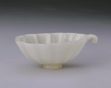 痕都斯坦白玉单耳叶式杯 痕都斯坦白玉单耳叶式杯,清,高4.5cm,口径11.3-7.9cm。清宫旧藏。 杯白玉质,胎薄体轻,呈花叶形,口、壁舒张而器足收束细小。单耳雕成叶蔓,杯身刻叶筋,花叶之形态既生动逼真,又颇富装饰性,雕琢之纹饰于简练中见精致。 此杯造型为典型的痕都斯坦风格,以凝脂般的白玉雕为花叶状,于清丽素雅中又显出富贵之气,当是清代御用之饮酒器。