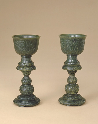 碧玉葫芦万代莲座高把杯 碧玉葫芦万代莲座高把杯,清,高18.1cm,口径7.4cm,足径7.4cm。清宫旧藏。 杯为一对,碧玉质地,由杯体与柄足两部分连接而成。杯体为钟铃倒置形,柄为葫芦形,杯体与葫芦形柄之间有一俯仰莲瓣形座,柄下为双层圆座。杯由上至下分别雕琢藤蔓、葫芦、缠枝莲、莲叶、雷纹等纹饰。 清代宫廷中各种形制的玉酒具一应俱全,且多为构思巧妙、工艺精细之作。此对杯造型独特,雕琢细腻,可称清宫玉酒具中的精品。
