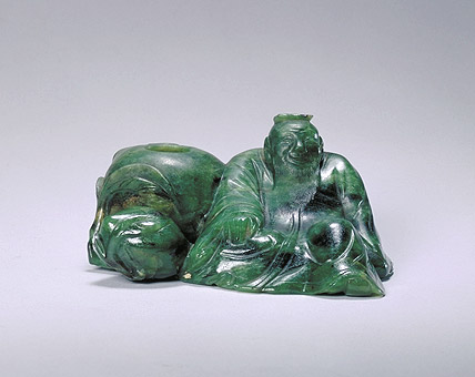 碧玉太白醉酒水丞 碧玉太白醉酒水丞,清,高4.7cm,长9.3cm,宽6.9cm,口径1.35cm。清宫旧藏。 水丞碧玉质,局部有墨斑,圆雕人物和桃式容器,大小二桃相连,大桃内空,用以盛水,旁又雕一人斜倚水丞,以手扶膝,神情欢愉酣畅。 古代瓷器、石雕、泥塑等工艺中常有此种“太白醉酒”题材的作品。