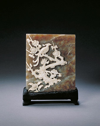 玛瑙花鸟纹小插屏 玛瑙花鸟纹小插屏,清道光,长9.5cm,宽8.3cm,厚1cm。清宫旧藏。 插屏玛瑙质,长方片状。正面运用俏色技法利用原料上的白色巧加碾琢,山岩、梅花、凤鸟错落其间,呼之欲出,衬以浅棕色的背景。背面阴刻隶书道光帝御制“探梅诗”: 何处寻芳信,前村消息来。 一枝依绿竹,几点逗苍苔。 影细因风瘦,心清待雪开。 春敷千万树,庚岭好音回。 末署“臣琦善敬书”,并阴刻篆书“臣”、“琦善”两印。 清代插屏用料多为白玉、青玉和碧玉,玛瑙料较罕见。此插屏更利用玛瑙料上间杂的白色雕成图案,别开生面,清雅宜人。