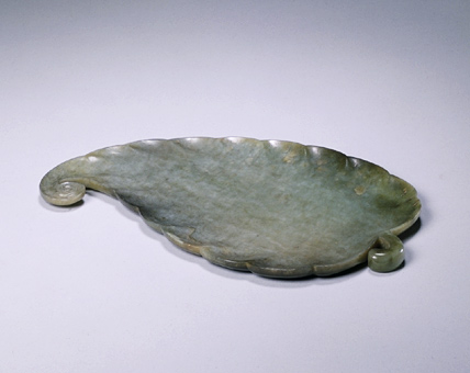 青玉叶式笔掭 青玉叶式笔掭,清,高0.8cm,长14.5cm,宽9.5cm。清宫旧藏。 笔掭青玉质,有黑斑,叶形,并琢叶蒂及叶之卷尖。叶表面略凹,凹面很浅,表明此器当是用作笔掭。叶底面雕筋脉纹。玉料上的黑斑为经火后留下的痕迹。 此笔掭之形制显然受西域装饰风格的影响,碾琢简练而富于装饰性。其青玉质润而色稍黯,着墨之后应愈显清雅沉着。