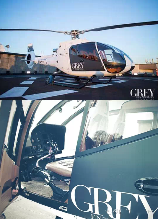 这架印有Grey企业logo的直升机是由欧洲直升机公司生产的EC130,内配两个褐色真皮座椅和Bose的降噪耳机,造价约为320万美元。
